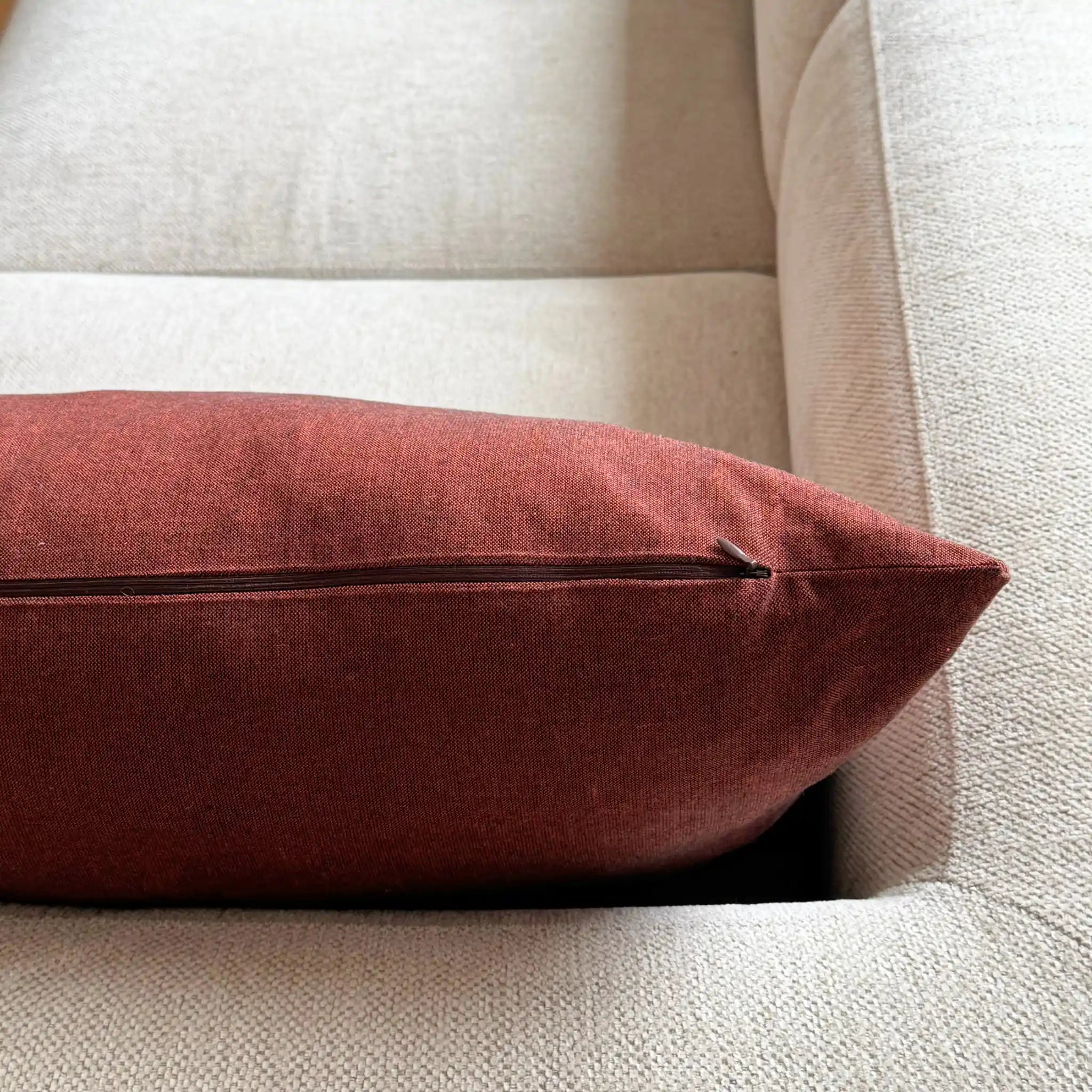Närbild av tegelrött kuddfodral i mjukt tyg med linnekänsla