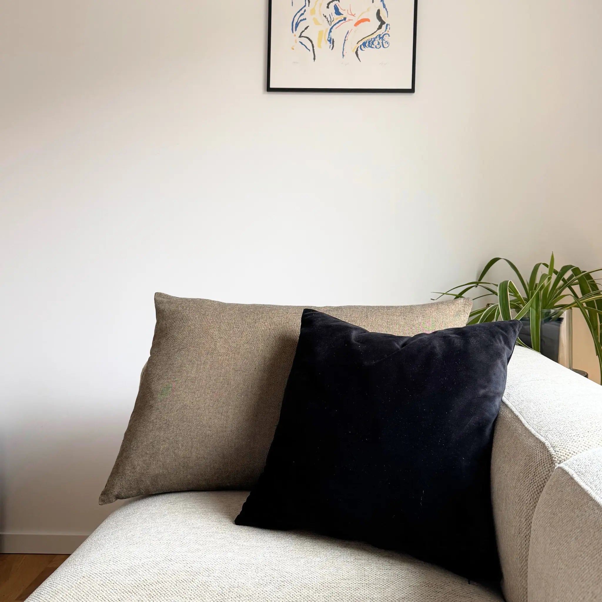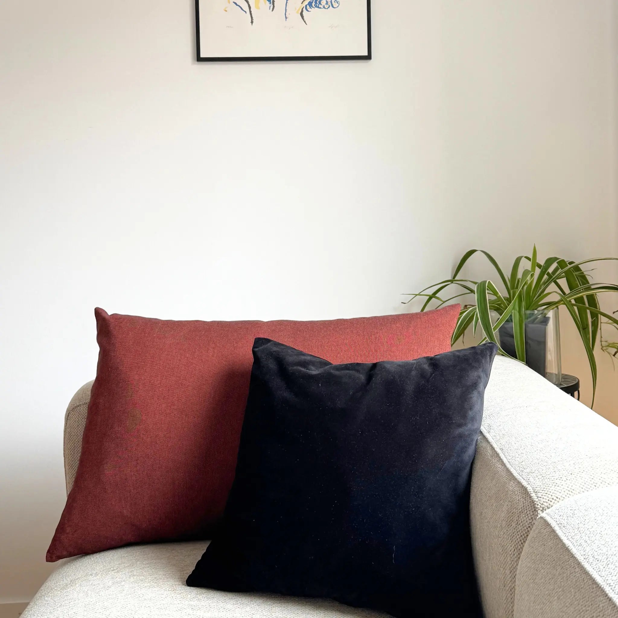 Tegelrött kuddfodral i mjukt tyg med linnekänsla tillsammans med svart kudde