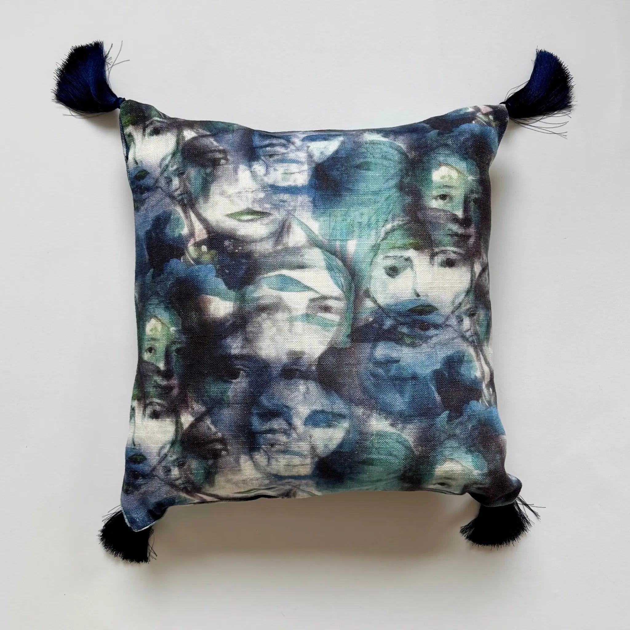 Lucy prydnadskudde med tofsar och unikt abstrakt ansiktsmönster i blå och gröna nyanser