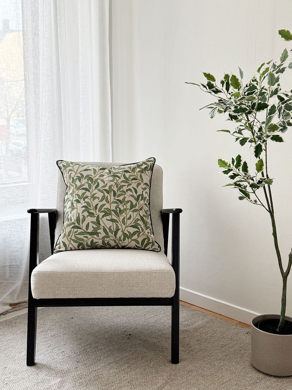 Olivia är ett naturligt, matt tyg i 81 % bomull och 19 % linne. Den blandade väven ger en lätt struktur och god slitstyrka, vilket gör det väl lämpat för prydnadskuddar, bordsdukar, gardiner – och även för möbelklädsel. Tyget känns ombonat och håller formen vid daglig användning. Maskintvätt 30 °C.
