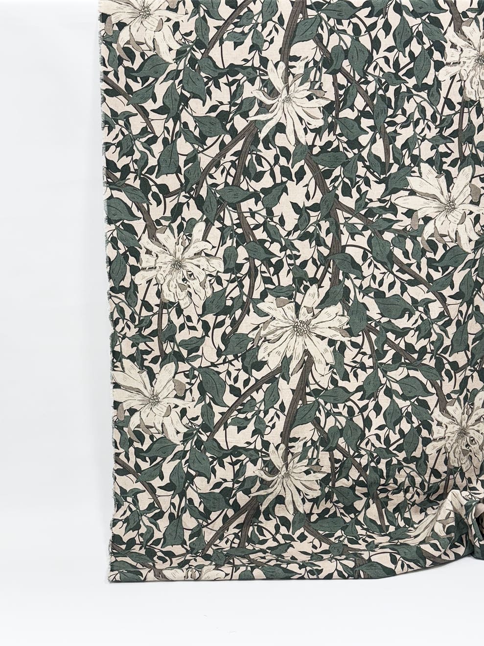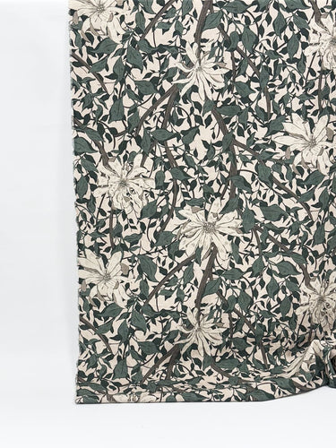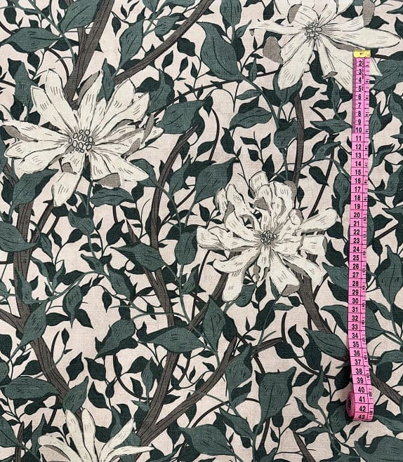 Siv är ett mjukt, matt tyg i 100 % bomull med ett naturnära mönster av vita blommor och slingrande grönbladiga. Den täta väven ger god hållbarhet för dekorativa ändamål som prydnadskuddar, gardiner, bordsdukar och lampskärmar. Tyget kan maskintvättas i 30 °C.